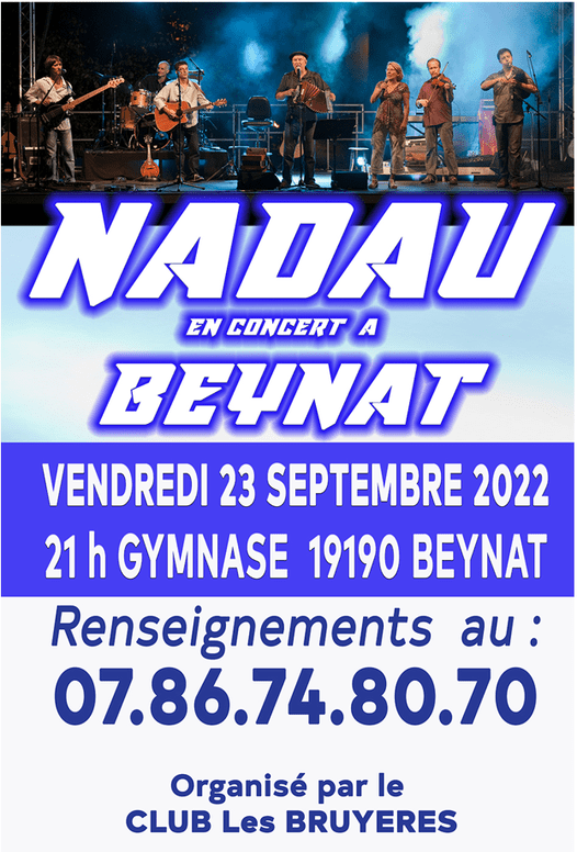 Dans le cadre des animations du prochain Festival Accordéon Passion organisé par le club des bruyères du 23 au 25 septembre 2022, le groupe de musique occitane Nadau sera en concert à Beynat le vendredi 23 septembre à 21h au gymnase.