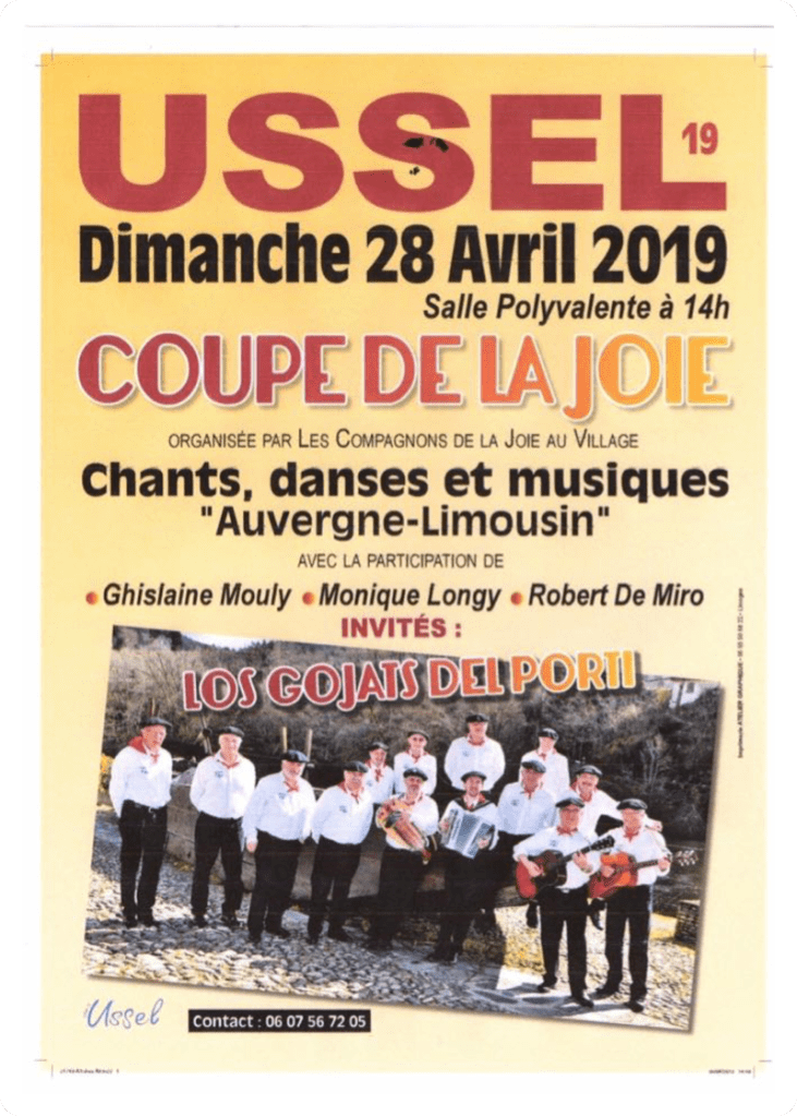 Auriac 2019Laguenne 2019Beynat 2019Ballad’Oc Tulle 2019Ussel 2019Festival Val de Dordogne 2018Le Chastang 2018Saint Pantaléon 2018Le Pont des Angles 2017Festival d’Argentat 2017Fête du Cochon à Neuville 2017EHPAD Saint Privat 2016Camps 2016Saint Chamant 2015La Chapelle Saint-Géraud 2015Marché de Noël 2014Téléthon 2014